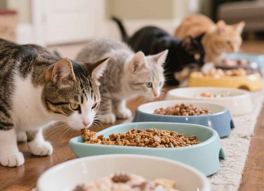 Multiple Cat Households: If you have cats of different ages, feeding them separately during transition periods prevents older cats from eating calorie-dense kitten food and younger cats from eating adult food prematurely.