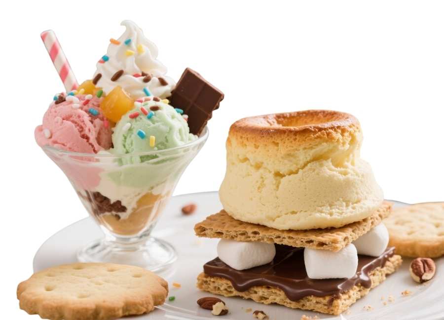 Sundae – Ice cream served with various toppings, such as syrups, nuts, and whipped cream.