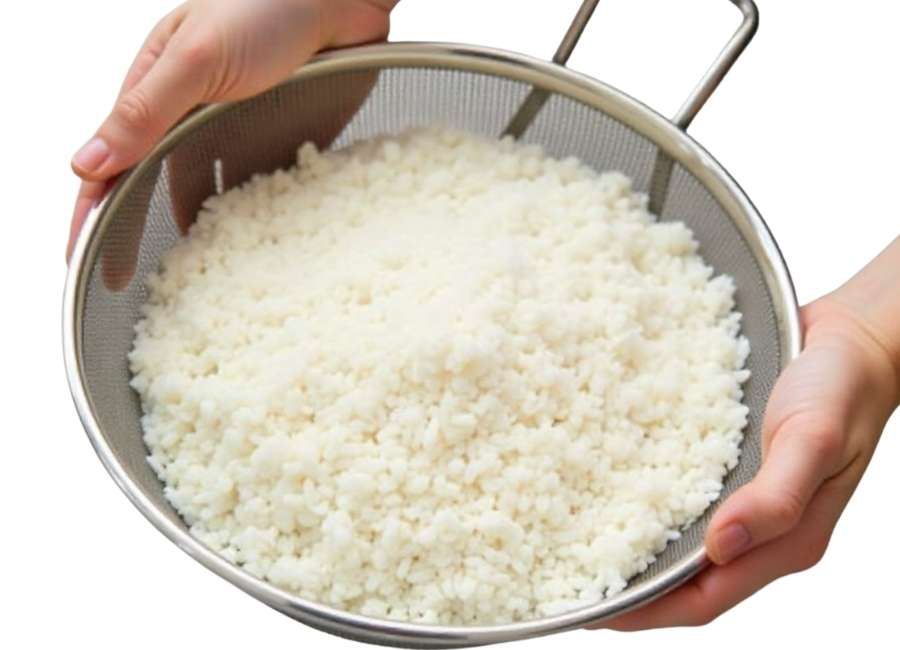 To rinse your rice, place it in a fine-mesh sieve and run it under cold water. Use your fingers to gently agitate the grains. You’ll notice the water running through will be cloudy at first. Continue rinsing until the water runs clear, which usually takes about a minute. Afterward, let the rice drain completely in the sieve for a few minutes to remove excess water.