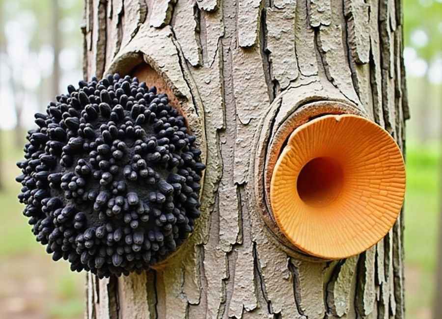 True shelf fungi have defined caps, stems, or bracket shapes, unlike chaga’s irregular, bulbous formation. Most shelf fungi also display lighter colors—browns, tans, or grays—rather than chaga’s distinctive black exterior.