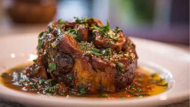 Osso Buco means “bone with a hole” and is a cross-cut from the veal shank. This cut has a bone filled with marrow in the center, which gives it a rich flavor. The shank meat is tougher than other veal cuts, so it needs slow, moist cooking like braising. Cooking it in liquid, such as wine, broth, and vegetables, breaks down the connective tissue, making the meat very tender and the sauce full of flavor from the marrow (Oliver, 2014).